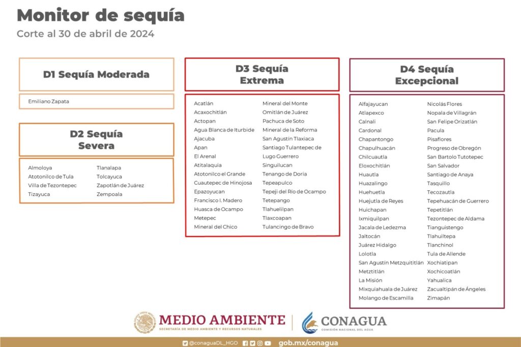 De acuerdo con el Monitor de Sequía en México, a través de la Dirección Local Hidalgo de la Comisión Nacional del Agua (Conagua), con corte al 30 de abril de 2024, se informa que 46 municipios reportan sequía excepcional (D4), 29 sequía extrema (D3), 8 sequía severa (D2) y 1 sequía moderada (D1), como se enlista a continuación: