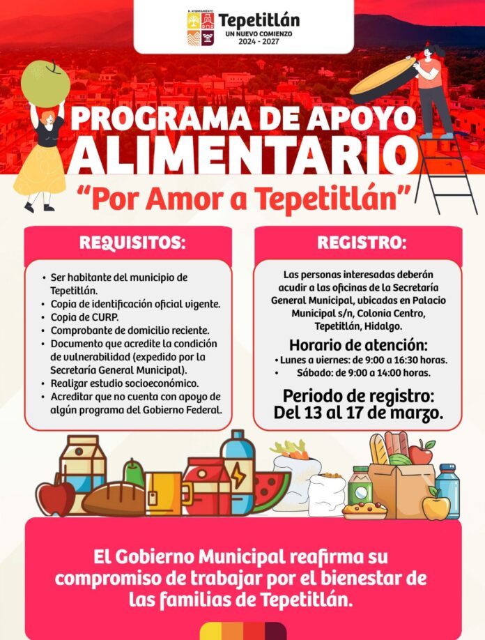 Con el objetivo de contribuir al bienestar y fortalecer la seguridad alimentaria de las familias del municipio, el Gobierno Municipal de Tepetitlán, Hidalgo, que dirige la presidenta Ana Elsa Castillo Cea, a través de la Secretaría General Municipal, emitió la convocatoria para participar en el Programa de Apoyo Alimentario mediante la entrega de despensas “Por Amor a Tepetitlán”.