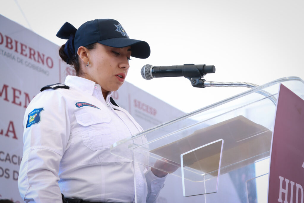A nombre de sus compañeras y compañeros, la policía tercero Meztli Quetzal García Hernández agradeció el respaldo brindado a los cuerpos de seguridad, reflejado en los aumentos salariales, la entrega de uniformes y el otorgamiento de equipo de trabajo, acciones que fortalecen su labor diaria y les permite servir con mayor dignidad y compromiso a la ciudadanía.