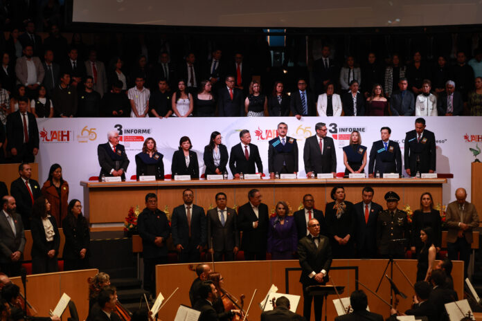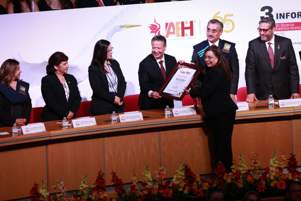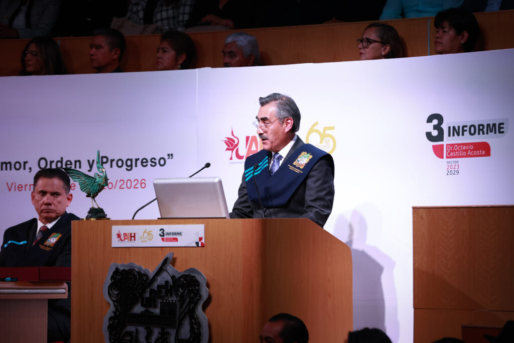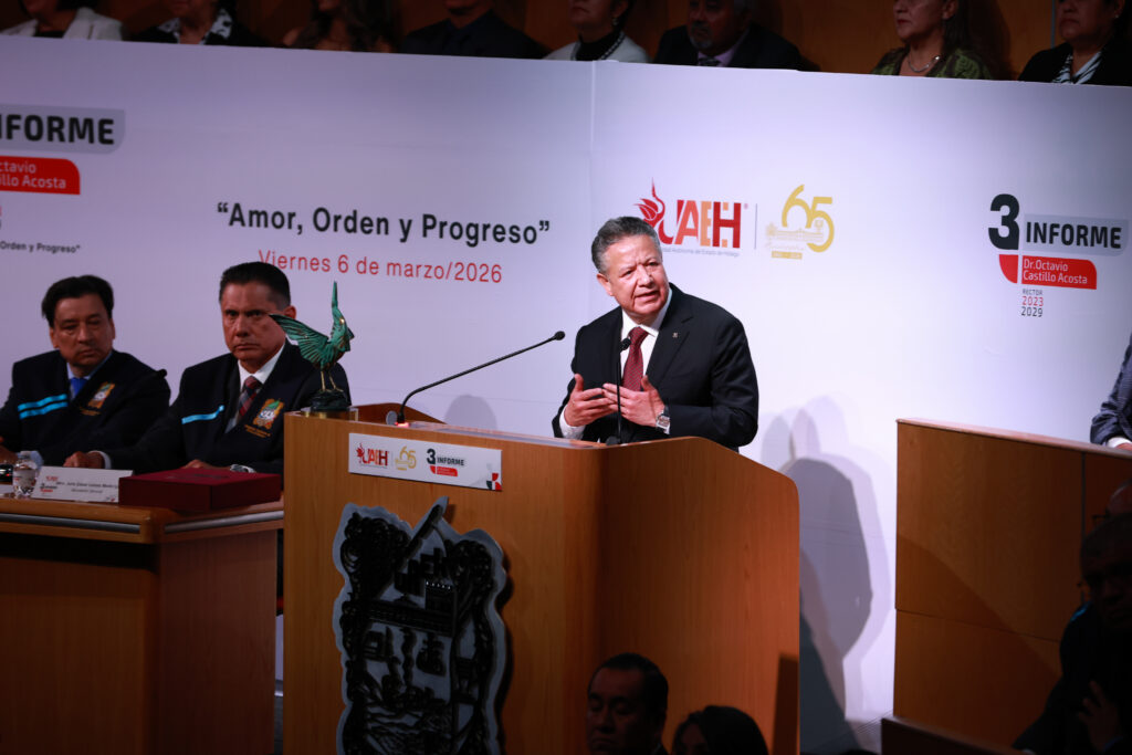 El gobernador Julio Menchaca Salazar atestiguó el tercer informe de la actual administración de la Universidad Autónoma del Estado de Hidalgo (UAEH), encabezada por el rector Octavio Castillo Acosta, donde reiteró el compromiso del gobierno estatal con el fortalecimiento de la educación como eje de transformación en la entidad.